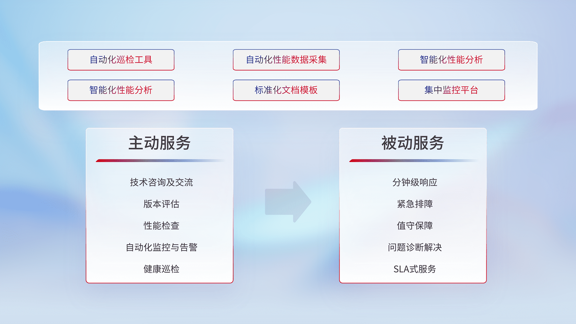智能化工具和标准化文档,保障服务质量,提供主动服务(包含技术咨询、版本评估、性能检查、自动化监控与告警、健康巡检)和被动服务包含(分钟级响应、紧急排障、值守保障、问题诊断解决、SLA服务)。